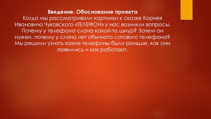 Введение. Обоснование проекта Когда мы рассматривали картинки к сказке Корнея Ивановича Чуковского «ТЕЛЕФОН» у нас возникли вопросы. Почему у телефона слона какой-то шнур? Зачем он нужен. почему у слона нет обычного сотового телефона? Мы решили узнать