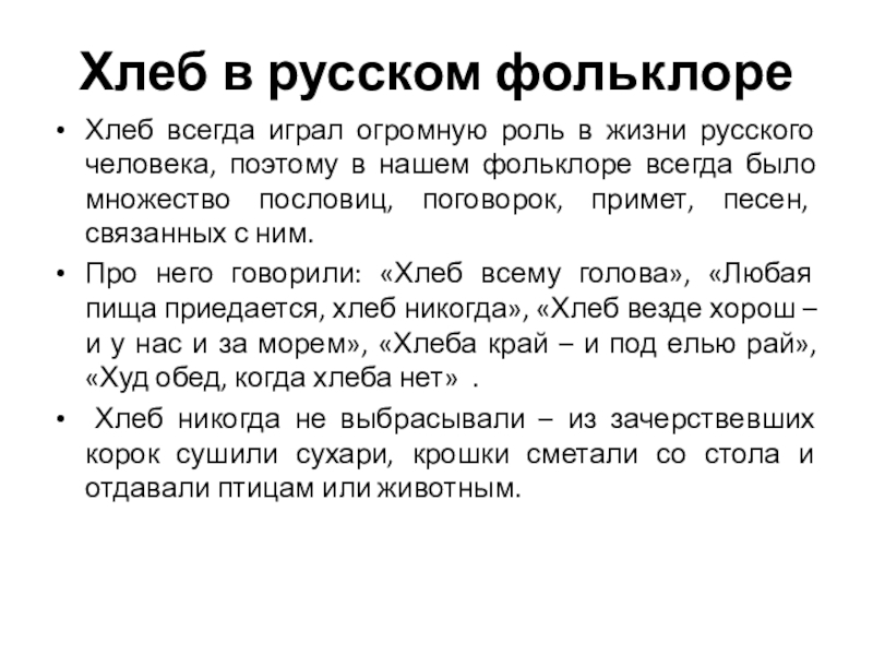 Про него говорили: «Хлеб всему голова», «Любая пища приедается, хлеб никогда», «Хлеб везде хорош – и у нас и за морем», «Хлеба край – и под елью рай», «Худ обед, когда хлеба нет» .