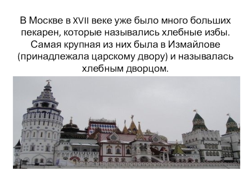 назывались хлебные избы. Самая крупная из них была в Измайлове (принадлежала царскому двору) и называлась хлебным дворцом.