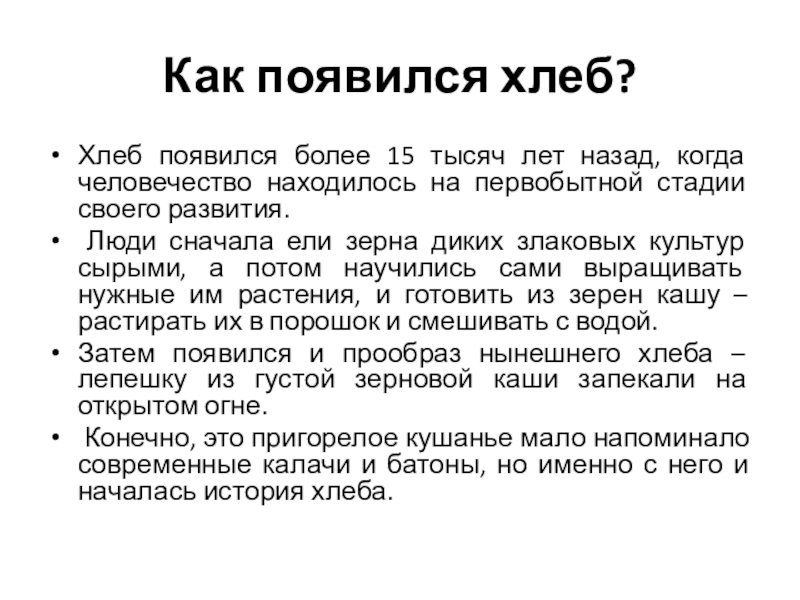 Конечно, это пригорелое кушанье мало напоминало современные калачи и батоны, но именно с него и началась история хлеба.
