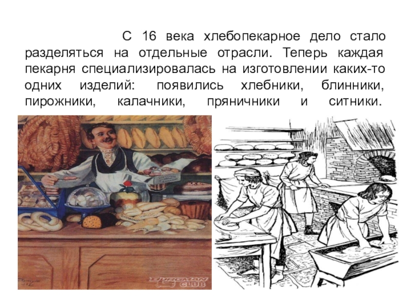стало разделяться на отдельные отрасли. Теперь каждая пекарня специализировалась на изготовлении каких-то одних изделий: появились хлебники, блинники, пирожники, калачники, пряничники и ситники.