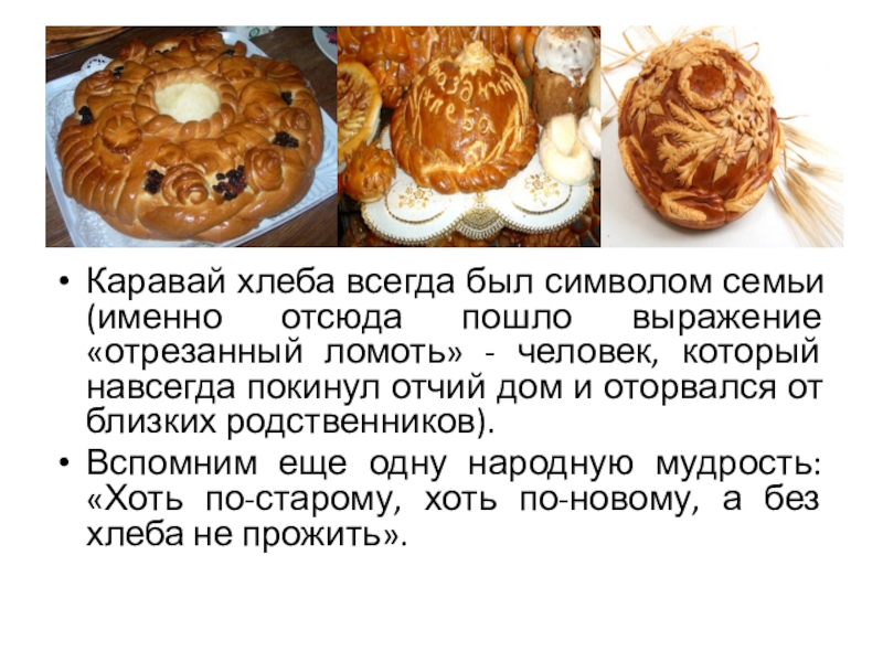 Слайд 13Каравай хлеба всегда был символом семьи (именно отсюда пошло выражение «отрезанный