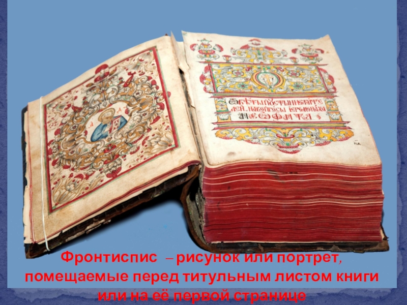 Слайд 8Фронтиспис – рисунок или портрет, помещаемые перед титульным листом книги или