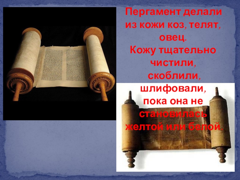 Пергамент делали из кожи коз, телят, овец. Кожу тщательно чистили, скоблили, шлифовали, пока она не становилась желтой