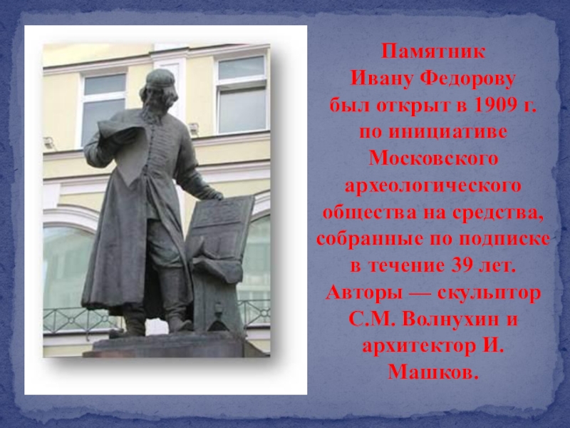 Памятник Ивану Федорову был открыт в 1909 г. по инициативе Московского археологического общества на средства, собранные по