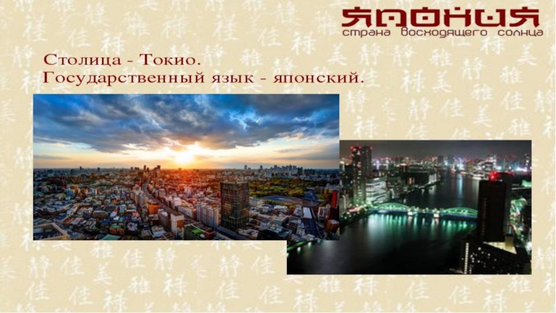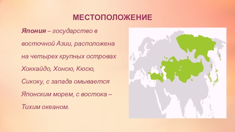 МЕСТОПОЛОЖЕНИЕЯпония – государство в восточной Азии, расположена на четырех крупных островах Хоккайдо, Хонсю, Кюсю, Сикоку, с запада омывается Японским морем, с востока – Тихим океаном.