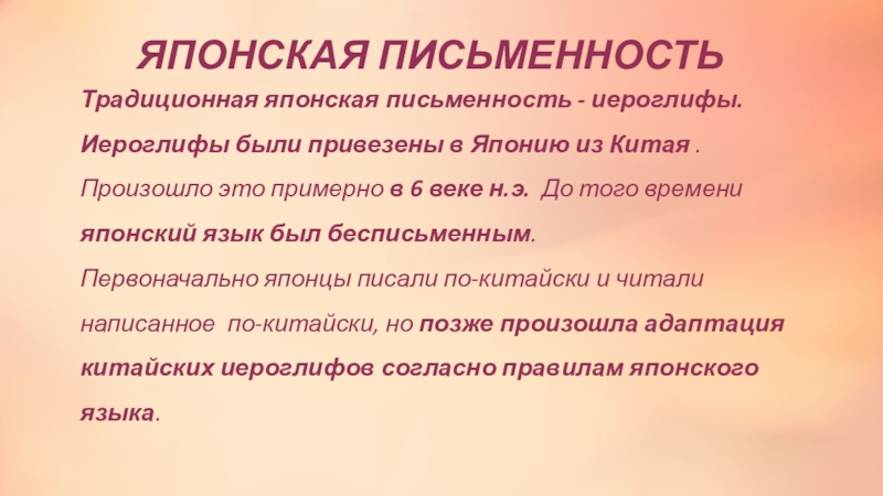 ЯПОНСКАЯ ПИСЬМЕННОСТЬТрадиционная японская письменность - иероглифы.Иероглифы были привезены в Японию из Китая . Произошло это примерно в
