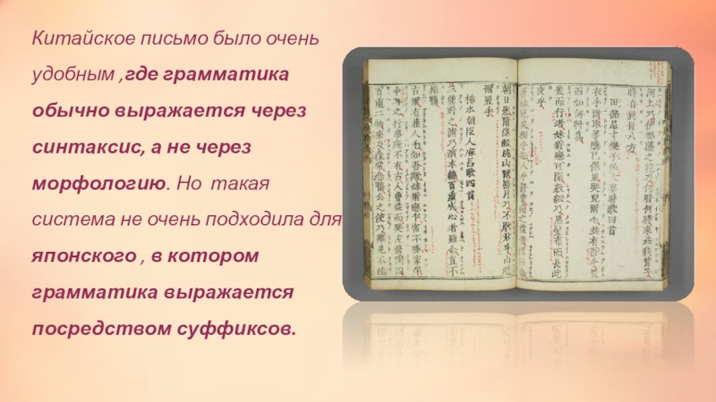 Слайд 6Китайское письмо было очень удобным ,где грамматика обычно выражается через синтаксис,