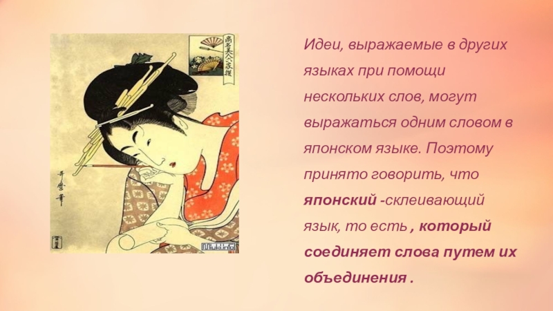 одним словом в японском языке. Поэтому принято говорить, что японский -склеивающий язык, то есть , который соединяет слова путем их объединения .
