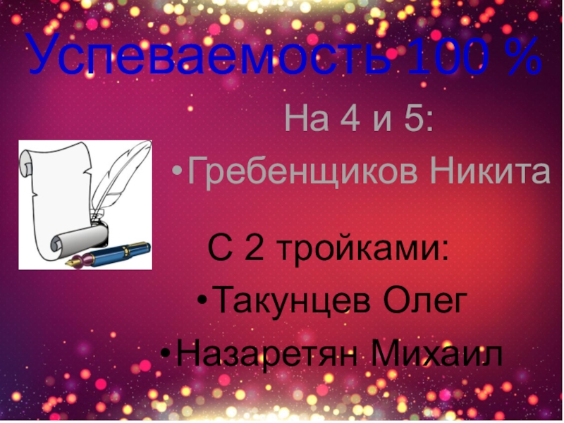 Успеваемость 100 %С 2 тройками:Такунцев ОлегНазаретян МихаилНа 4 и 5:Гребенщиков Никита