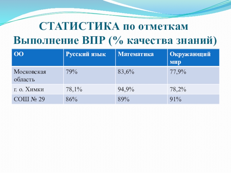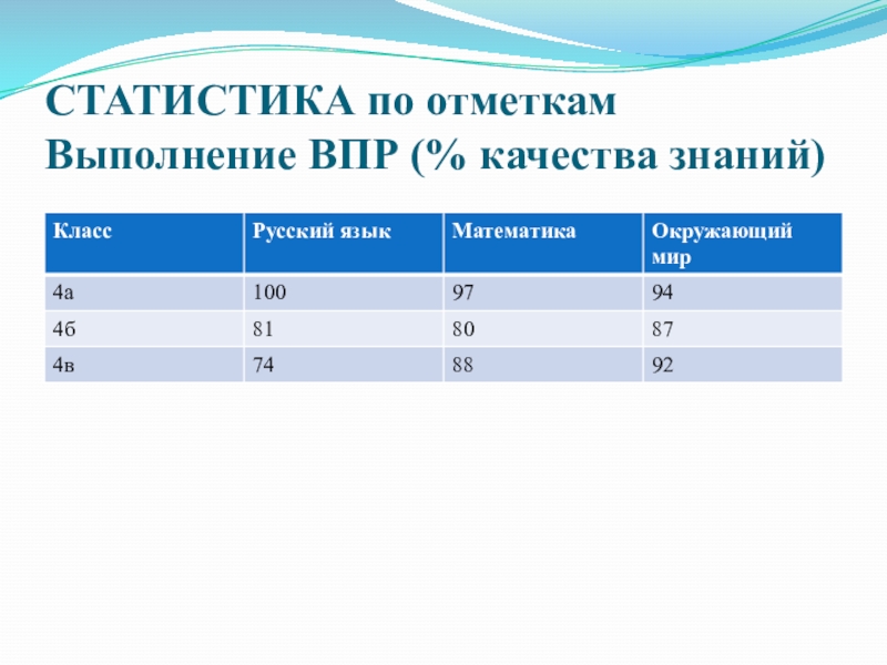 Слайд 17СТАТИСТИКА по отметкам Выполнение ВПР (% качества знаний)