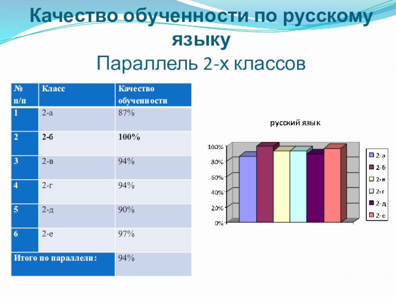 Слайд 6Качество обученности по русскому языку Параллель 2-х классов