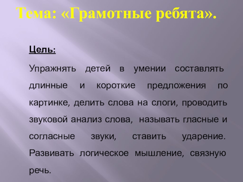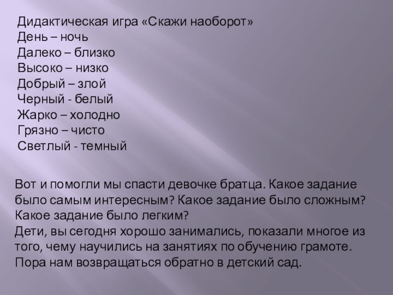 Дети, вы сегодня хорошо занимались, показали многое из того, чему научились на занятиях по обучению грамоте. Пора нам возвращаться обратно в детский сад.