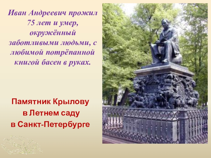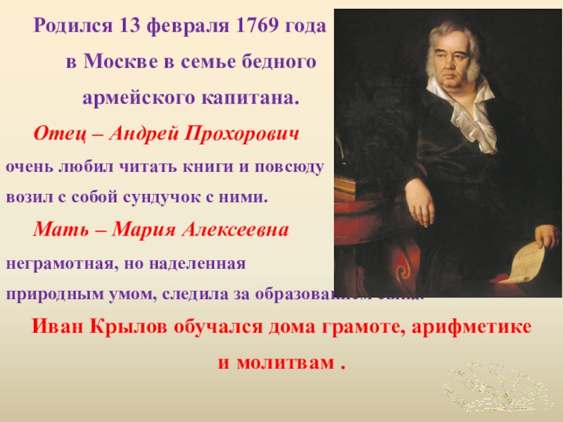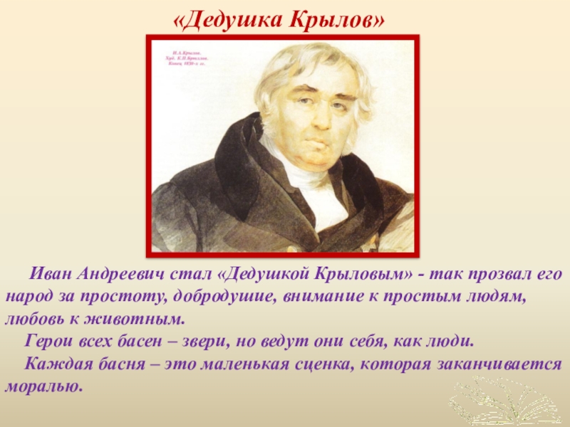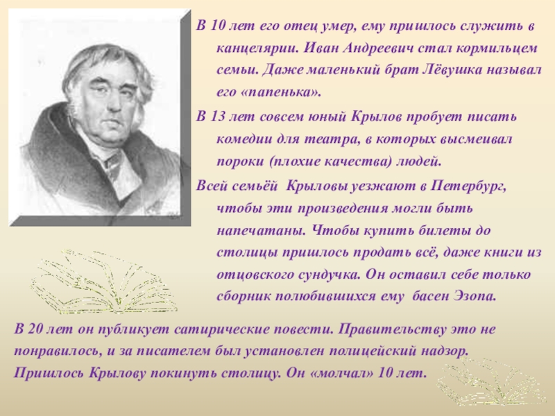 В 20 лет он публикует сатирические повести. Правительству это не понравилось, и за писателем был установлен полицейский надзор. Пришлось Крылову покинуть столицу. Он «молчал» 10 лет.