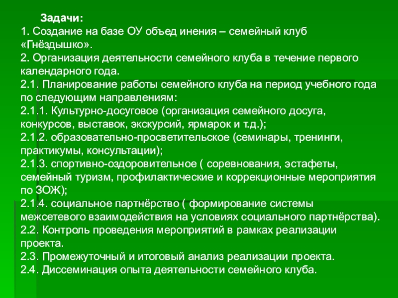 Задачи: 1. Создание на базе ОУ объед инения – семейный клуб «Гнёздышко».2. Организация деятельности семейного клуба в