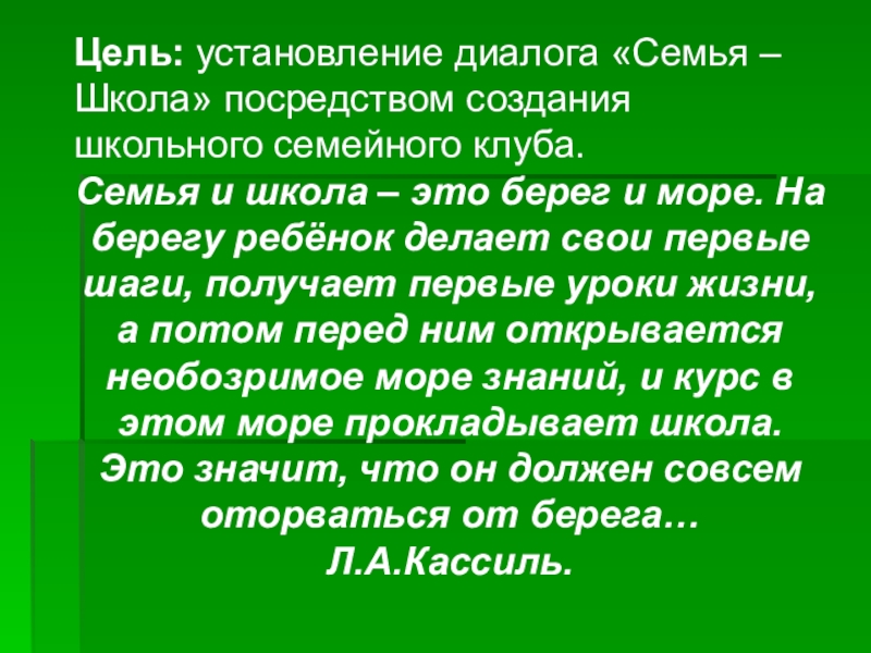 Цель: установление диалога «Семья – Школа» посредством создания школьного семейного клуба.Семья и школа – это берег и