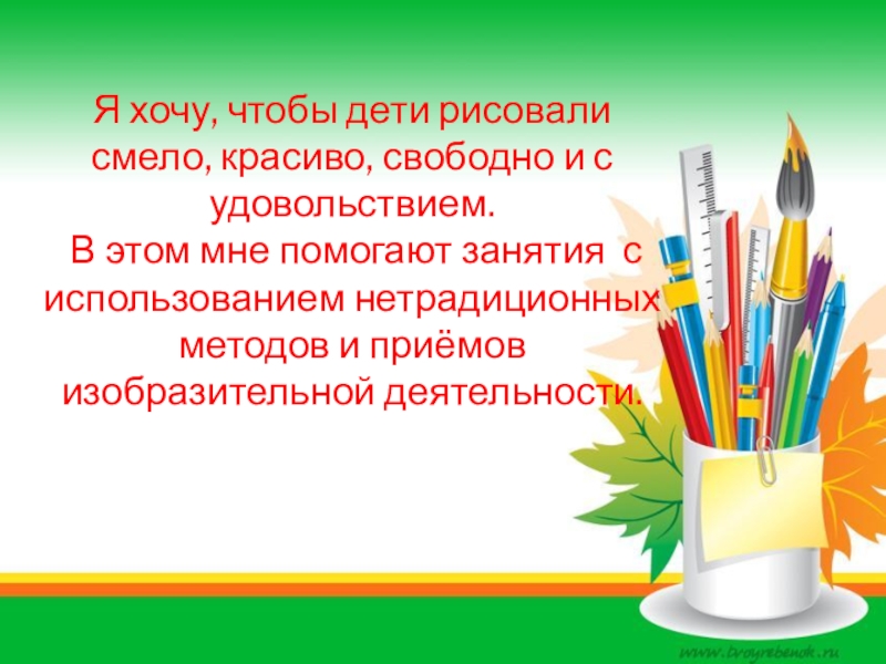 Слайд 2Я хочу, чтобы дети рисовали смело, красиво, свободно и с удовольствием.