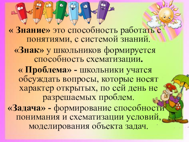 « Знание» это способность работать с понятиями, с системой знаний.«Знак» у школьников формируется способность схематизации.« Проблема» -