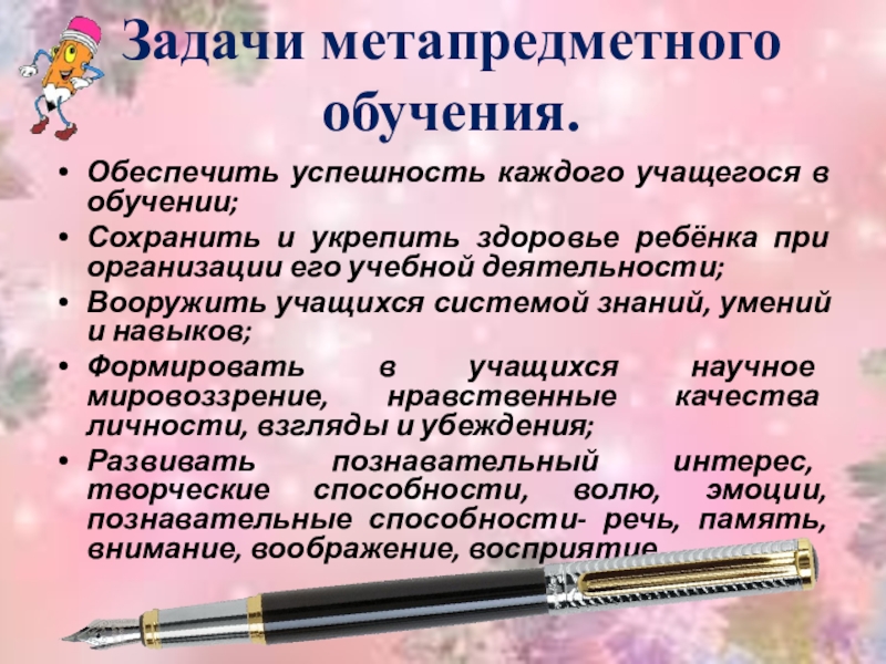 Задачи метапредметного обучения.Обеспечить успешность каждого учащегося в обучении;Сохранить и укрепить здоровье ребёнка при организации его учебной деятельности;Вооружить