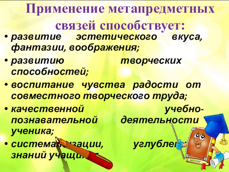 Применение метапредметных связей способствует: развитие эстетического вкуса, фантазии, воображения;развитию творческих способностей;воспитание чувства радости от совместного творческого труда;качественной
