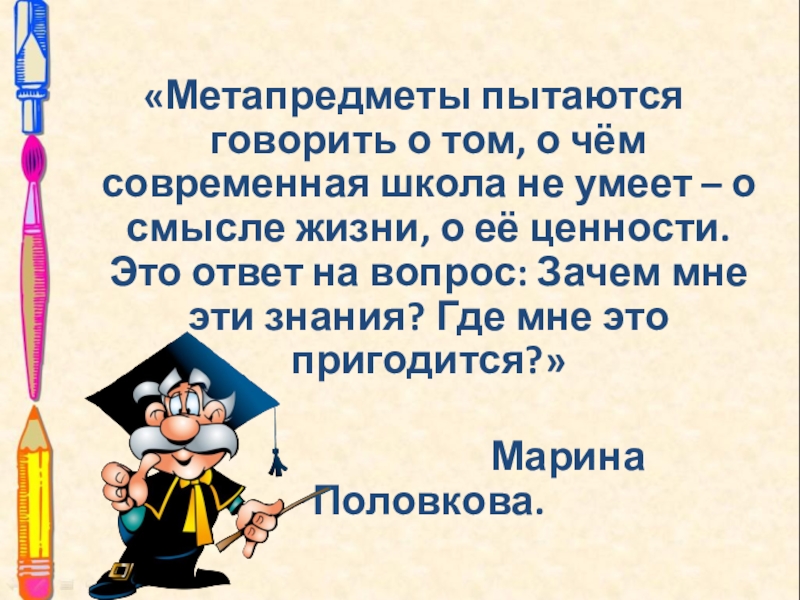 «Метапредметы пытаются говорить о том, о чём современная школа не умеет – о смысле жизни, о её ценности. Это ответ на вопрос: Зачем мне эти знания? Где мне это пригодится?»