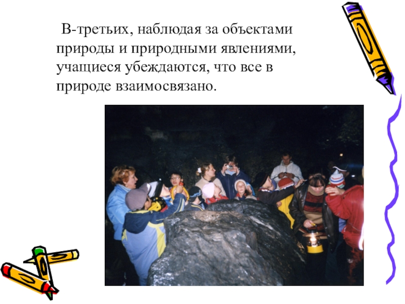Слайд 4 В-третьих, наблюдая за объектами природы и природными явлениями, учащиеся убеждаются, что