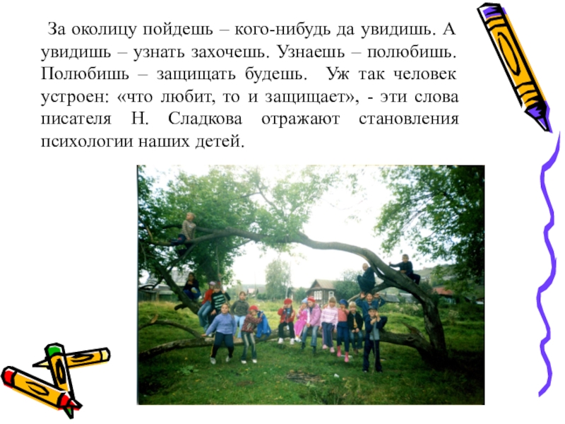 захочешь. Узнаешь – полюбишь. Полюбишь – защищать будешь. Уж так человек устроен: «что любит, то и защищает», - эти слова писателя Н. Сладкова отражают становления психологии наших детей.