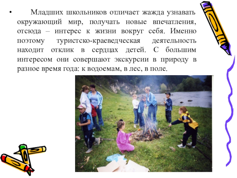 новые впечатления, отсюда – интерес к жизни вокруг себя. Именно поэтому туристско-краеведческая деятельность находит отклик в сердцах детей. С большим интересом они совершают экскурсии в природу в разное время года: к водоемам, в лес, в поле.