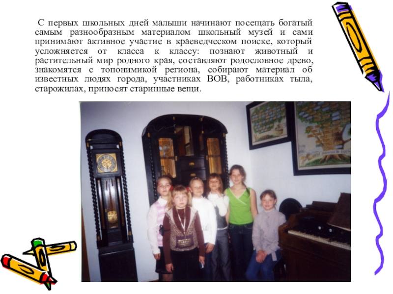 самым разнообразным материалом школьный музей и сами принимают активное участие в краеведческом поиске, который усложняется от класса к классу: познают животный и растительный мир родного края, составляют родословное древо, знакомятся с топонимикой региона, собирают материал об известных людях города, участниках ВОВ, работниках тыла, старожилах, приносят старинные вещи.