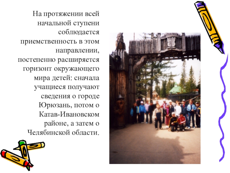 этом направлении, постепенно расширяется горизонт окружающего мира детей: сначала учащиеся получают сведения о городе Юрюзань, потом о Катав-Ивановском районе, а затем о Челябинской области.