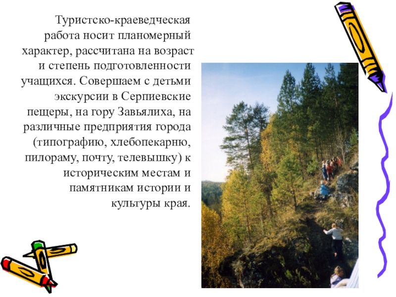 Слайд 13 Туристско-краеведческая работа носит планомерный характер, рассчитана на возраст