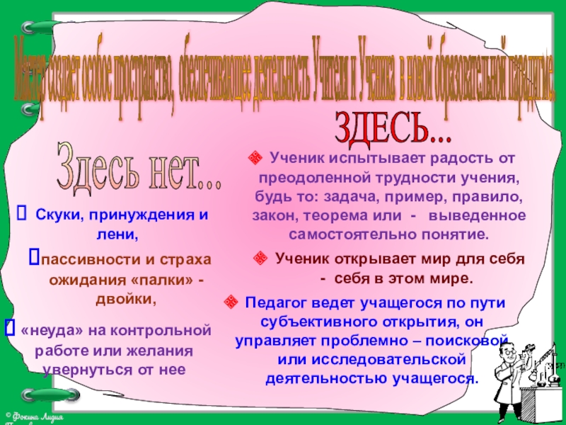 Педагог ведет учащегося по пути субъективного открытия, он управляет проблемно – поисковой или исследовательской деятельностью учащегося.