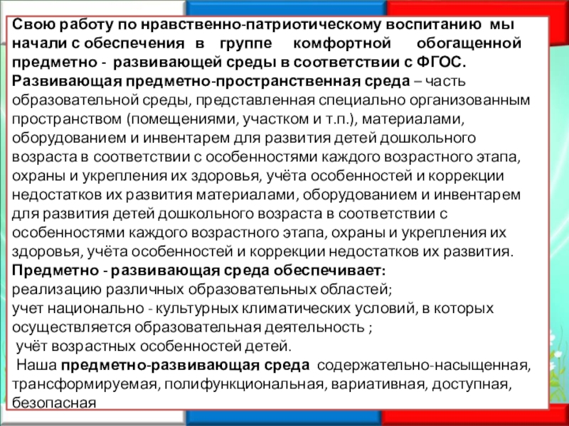 Свою работу по нравственно-патриотическому воспитанию мы начали с обеспечения