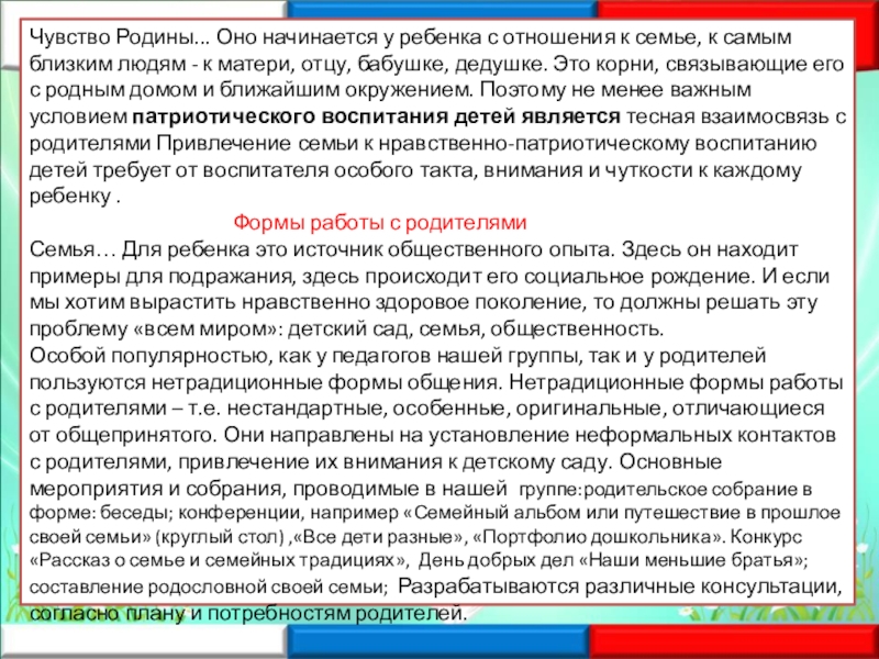 самым близким людям - к матери, отцу, бабушке, дедушке. Это корни, связывающие его с родным домом и ближайшим окружением. Поэтому не менее важным условием патриотического воспитания детей является тесная взаимосвязь с родителями Привлечение семьи к нравственно-патриотическому воспитанию детей требует от воспитателя особого такта, внимания и чуткости к каждому ребенку .