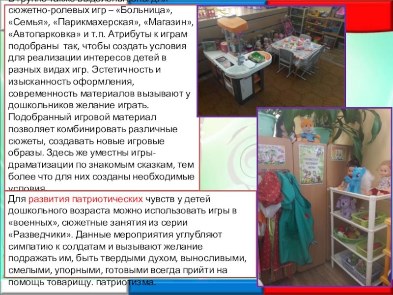 «Парикмахерская», «Магазин», «Автопарковка» и т.п. Атрибуты к играм подобраны так, чтобы создать условия для реализации интересов детей в разных видах игр. Эстетичность и изысканность оформления, современность материалов вызывают у дошкольников желание играть. Подобранный игровой материал позволяет комбинировать различные сюжеты, создавать новые игровые образы. Здесь же уместны игры-драматизации по знакомым сказкам, тем более что для них созданы необходимые условия.