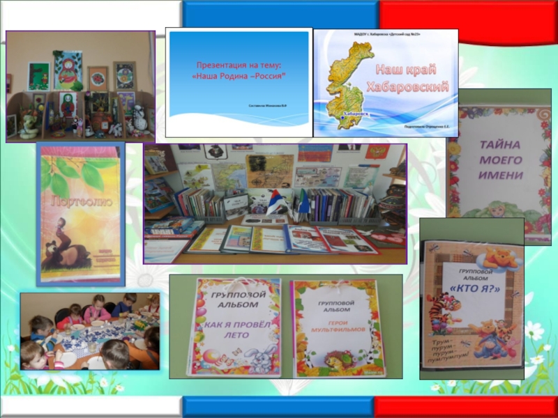 Уголок патриотического воспитания. Патриотический уголок в детском саду помогает познакомить детей: с историей и достопримечательностями родного края, животными и растениями; с государственными символами родной страны и нашего Хабаровского края (флагом, гербом, гимном, портретами президента и главы города); с русскими народными промыслами и традициями коренных народов. Благодаря материалам такой зоны развивается интерес и уважение детей к своей семье и своему дошкольному учреждению, труду людей разных профессий, достижениям известных людей города и страны; способствует формированию патриотических чувств. Здесь представлены фотоальбомы, иллюстрации, коллекции открыток с изображением Хабаровска, книги, карты, игры, наши совместные проекты, сувениры.