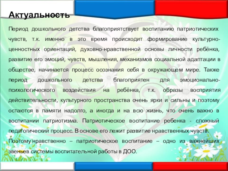 время происходит формирование культурно-ценностных ориентаций, духовно-нравственной основы личности ребёнка, развитие его эмоций, чувств, мышления, механизмов социальной адаптации в обществе, начинается процесс осознания себя в окружающем мире. Также период дошкольного детства благоприятен для эмоционально-психологического воздействия на ребёнка, т.к. образы восприятия действительности, культурного пространства очень ярки и сильны и поэтому остаются в памяти надолго, а иногда и на всю жизнь, что очень важно в воспитании патриотизма. Патриотическое воспитание ребенка - сложный педагогический процесс. В основе его лежит развитие нравственных чувств.