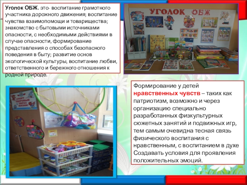 Слайд 12Уголок ОБЖ. это- воспитание грамотного участника дорожного движения; воспитание чувства взаимопомощи