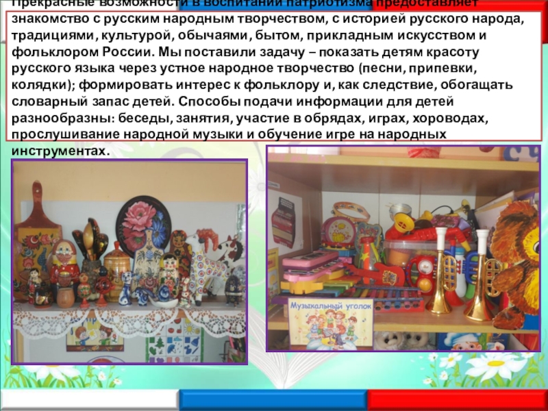 Слайд 13Прекрасные возможности в воспитании патриотизма предоставляет знакомство с русским народным творчеством,
