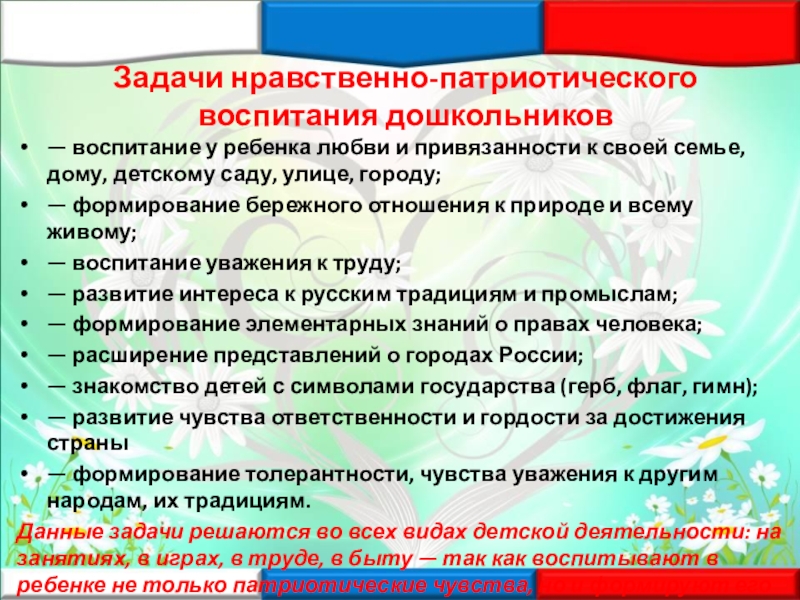 Данные задачи решаются во всех видах детской деятельности: на занятиях, в играх, в труде, в быту — так как воспитывают в ребенке не только патриотические чувства, но и формируют его взаимоотношения со взрослыми и сверстниками.