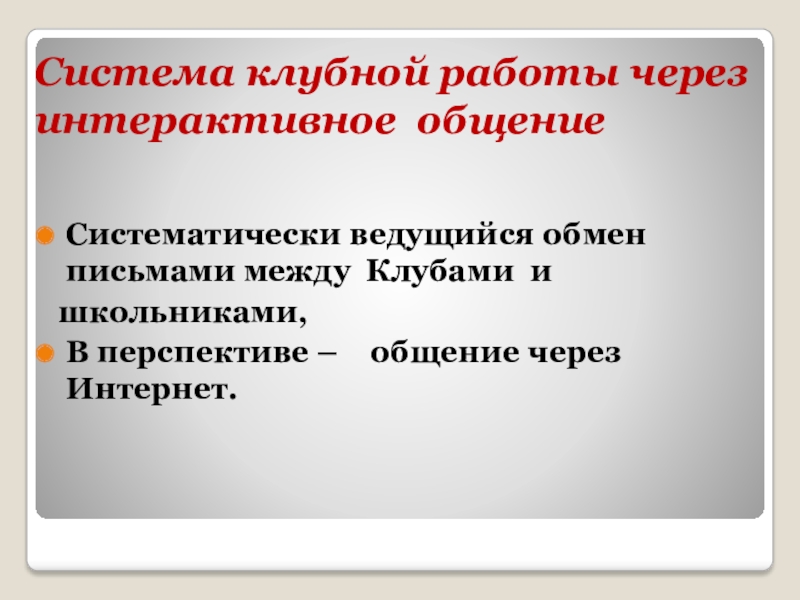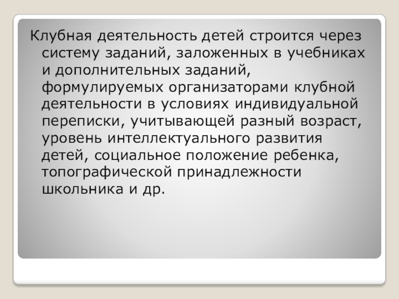 дополнительных заданий, формулируемых организаторами клубной деятельности в условиях индивидуальной переписки, учитывающей разный возраст, уровень интеллектуального развития детей, социальное положение ребенка, топографической принадлежности школьника и др.