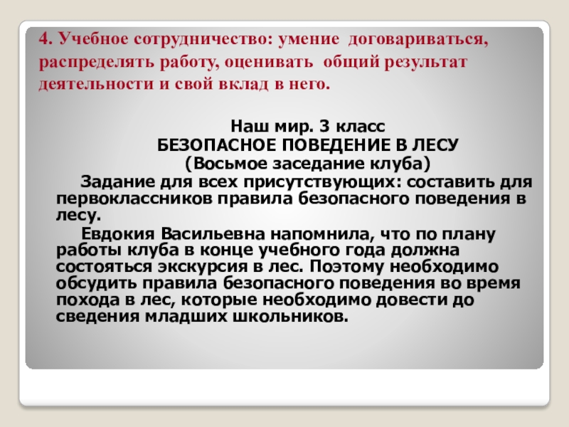 Евдокия Васильевна напомнила, что по плану работы клуба в конце учебного года должна состояться экскурсия в лес. Поэтому необходимо обсудить правила безопасного поведения во время похода в лес, которые необходимо довести до сведения младших школьников.