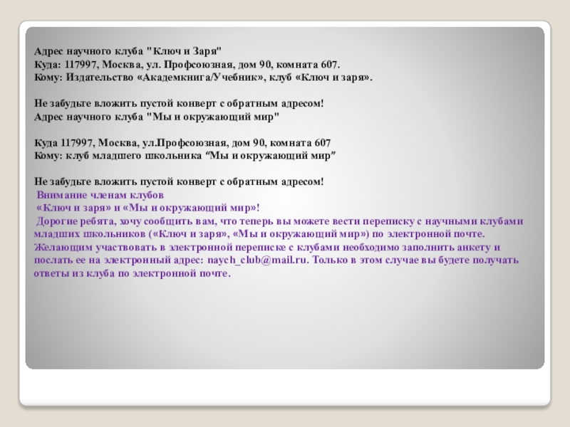 Слайд 10Адрес научного клуба "Ключ и Заря"