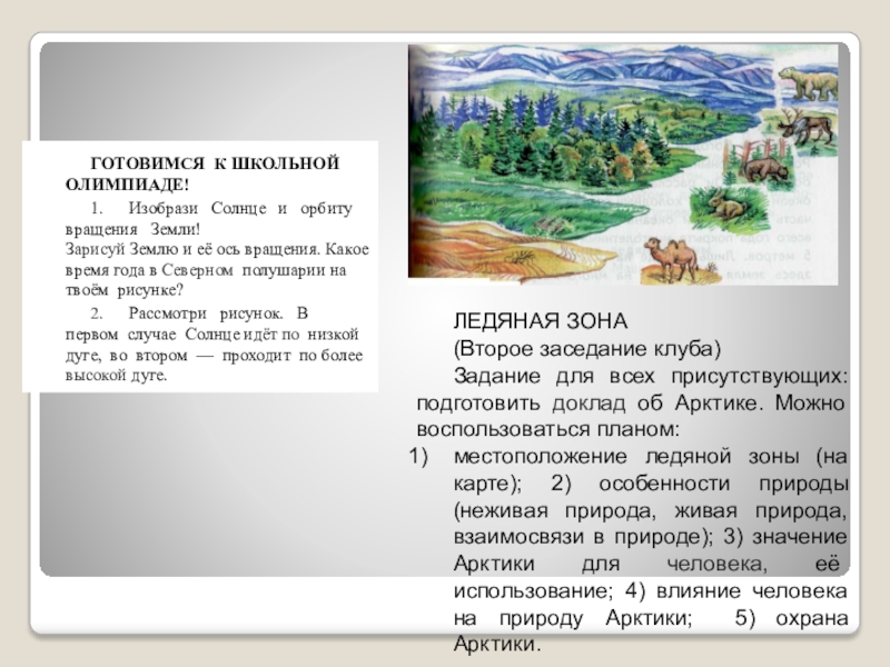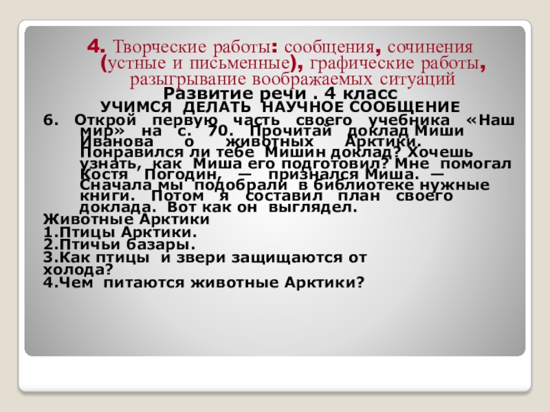 6. Открой первую часть своего учебника «Наш мир» на с. 70. Прочитай доклад Миши Иванова о животных Арктики. Понравился ли тебе Мишин доклад? Хочешь узнать, как Миша его подготовил? Мне помогал Костя Погодин, — признался Миша. — Сначала мы подобрали в библиотеке нужные книги. Потом я составил план своего доклада. Вот как он выглядел.