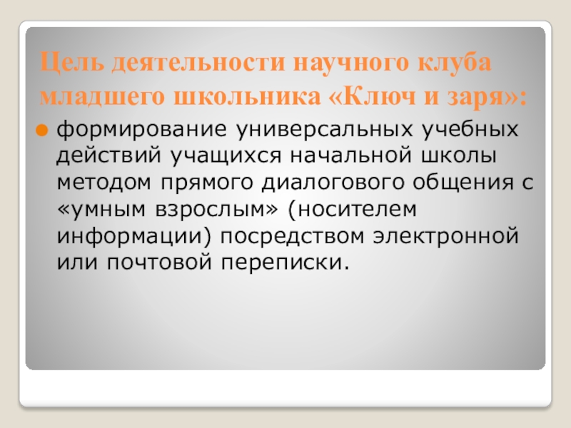 Слайд 6Цель деятельности научного клуба младшего школьника «Ключ и заря»:
