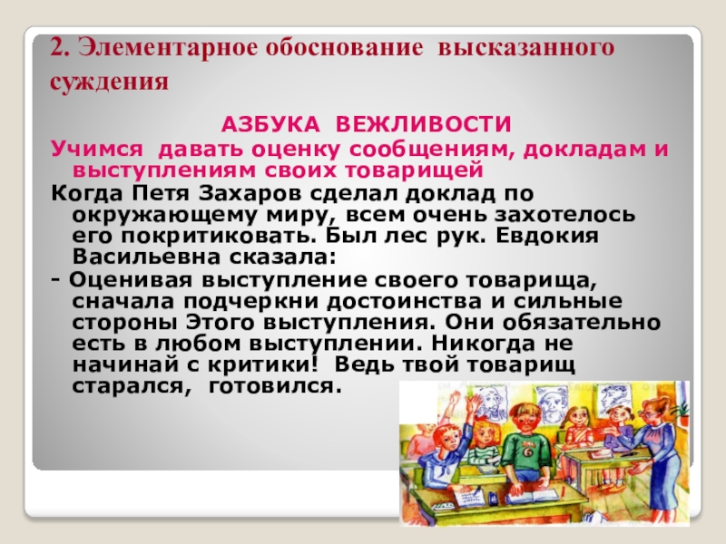 - Оценивая выступление своего товарища, сначала подчеркни достоинства и сильные стороны Этого выступления. Они обязательно есть в любом выступлении. Никогда не начинай с критики! Ведь твой товарищ старался, готовился.