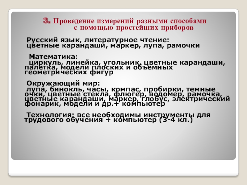 лупа, бинокль, часы, компас, пробирки, темные очки, цветные стекла, флюгер, водомер, рамочка, цветные карандаши, маркер, глобус, электрический фонарик, модели и др.+ компьютер