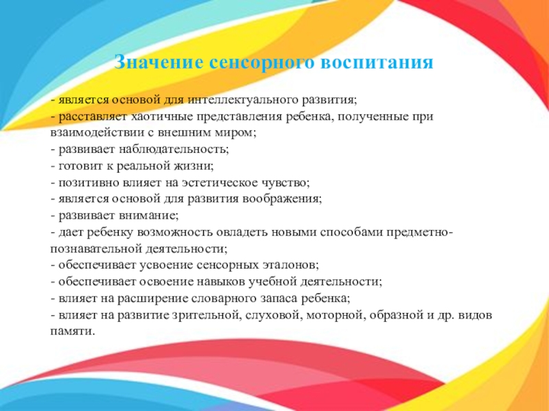 формирования сенсорной культуры. Успешность умственного, физического, эстетического воспитания в значительной степени зависит от уровня сенсорного воспитания, то есть от того, насколько совершенно ребенок слышит, видит, осязает окружающее.