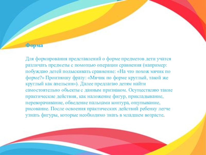 помощью операции сравнения (например: побуждаю детей подыскивать сравнение: «На что похож мячик по форме?» Произношу фразу: «Мячик по форме круглый, такой же круглый как апельсин»). Далее предлагаю детям найти самостоятельно объекты с данным признаком. Осуществляю такие практические действия, как наложение фигур, прикладывание, переворачивание, обведение пальцами контура, ощупывание, рисование. После освоения практических действий ребенку легче узнать фигуры, которые необходимо знать в младшем возрасте.