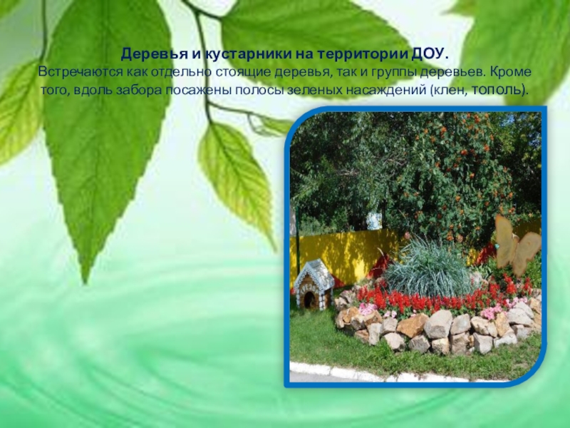 так и группы деревьев. Кроме того, вдоль забора посажены полосы зеленых насаждений (клен, тополь).